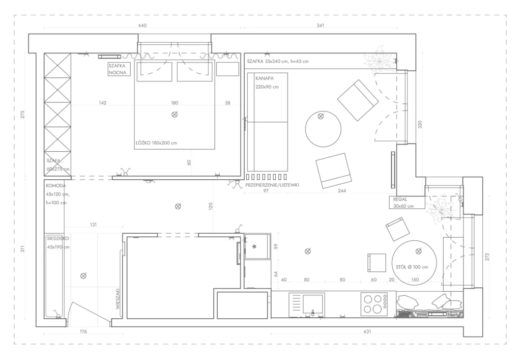 Przygotowanie koncepcji rozmieszczenia ścian i elementów wyposażenia wnętrz. Propozycja będzie przedstawiona w formie rzutu mieszkania z pokazaniem gabarytów wyposażenia, wzajemnej relacji tych elementów oraz wskazaniem charakterystycznych wymiarów. Dzięki temu możliwy będzie wybór najbardziej funkcjonalnego układu pomieszczenia.