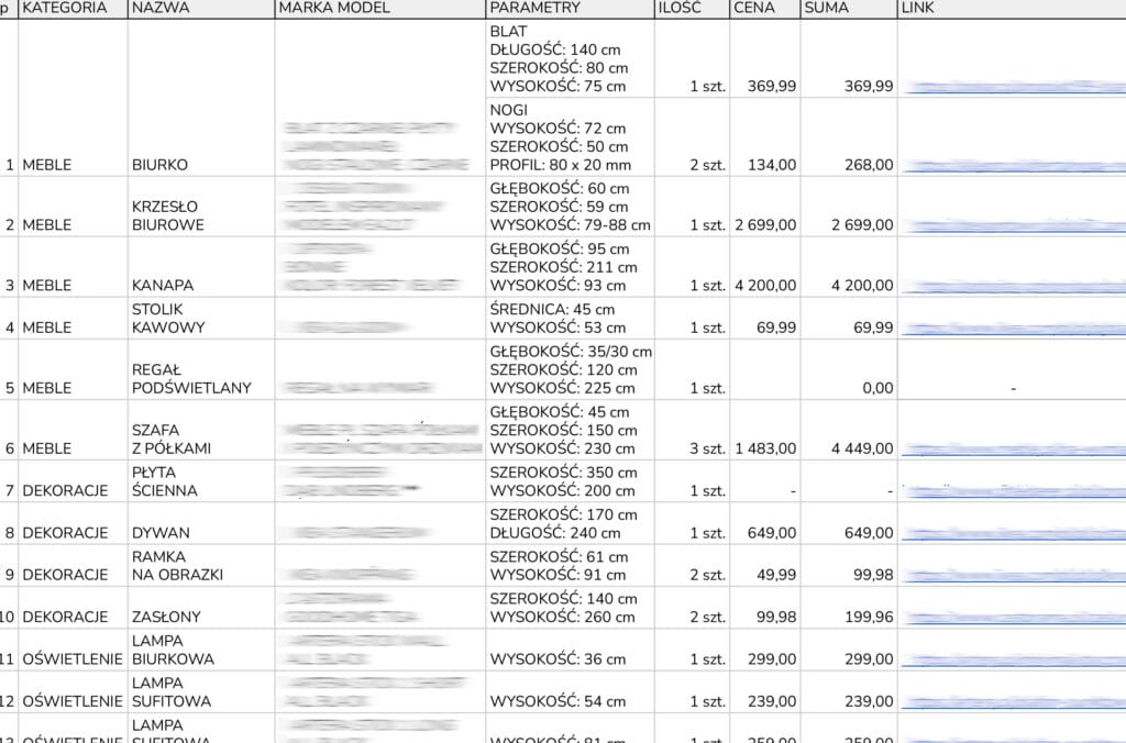 W tym dokumencie znajdą się informacje na temat wymiarów, powierzchni oraz kolorystyki wybranych elementów. Do powyższego zestawienia zostanie dodany szacunkowy kosztorys.